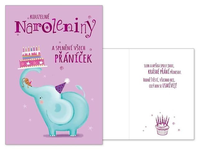 Veselé dětské přání se slonem a dortem. Blahopřání obsahuje text. Text na přední straně přání: Kouzelné narozeni a splnění všech přáníček Text uvnitř přání: Slon a myška spolu jdou, krásné přání přinesou. Hodně štěstí, všechno nej, celý den se usmívej. Papír: pohlednicový karton 300 g Přání je baleno v sáčku, součástí balení je i dopisní obálka Přání je na obale označené doporučenou prodejní cenou.