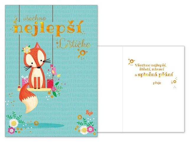 Veselé dětské přání k narozeninám nebo svátku. Blahopřání obsahuje text. Text na přední straně přání: Všechno nejlepší lištičko Text uvnitř přání: Všechno nejlepší, štěstí, zdraví a splněná přání přeje Papír: pohlednicový karton 300 g Přání je baleno v sáčku, součástí balení je i dopisní obálka Přání je na obale označené doporučenou prodejní cenou.
