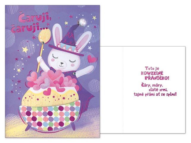 Veselé dětské přání s textem a s obrázkem králíčka zajisté potěší každou dětskou duši. Text na přední straně přání: Čaruji, čaruji... Text uvnitř přání: Toto je kouzelné přáníčko! Čáry, máry, zlaté zrní, tajné přání ať se splní! Nápis je ražený růžovou folií, součástí přání je obálka. Přání je na obale označené doporučenou prodejní cenou.