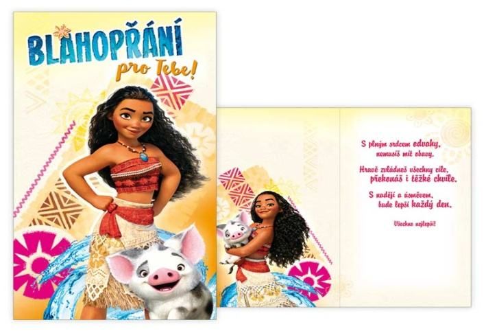 Dětské přání k narozeninám s obrázkem z pohádky Odvážná Vaiana: Legenda o konci světa od Walt Disney. Takovéto přání je sen každé malé holčičky. Přáním s obrázkem oblíbené pohádkové postavičky uděláte velkou radost každé malé slečně. Přání s textem. Text na přední straně přání: Blahopřání pro tebe! Text uvnitř přání: S plným srdcem odvahy, nemusíš mít obavy. Hravě zvládneš všechny cíle, překonáš i těžké chvíle. S nadějí a úsměvem, bude lepší každý den! Všechno nejlepší! Papír: pohlednicový karton 240 g Přání je baleno v sáčku, součástí balení je i dopisní obálka