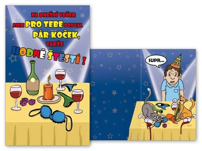 Veselé, humorné přání pro muže k narozeninám. Nejen, že uděláte někomu radost tím, že jste si na něj vzpomněli, ale navíc ho pobavíte. Text na přední straně přání: Na dnešní večer jsem pro Tebe pozval pár koček, takže hodně štěstí ! Text uvnitř přání: SUPR… Papír: pohlednicový karton 240 g Přání je baleno v sáčku, součástí balení je i dopisní obálka
