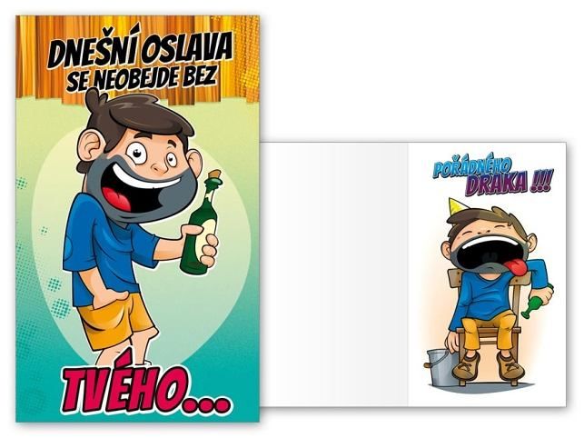 Veselé, humorné přání k narozeninám. Nejen, že uděláte někomu radost tím, že jste si na něj vzpomněli, ale navíc ho pobavíte. Prání je s textem. Text na přední straně přání: Dnešní oslava se neobejde bez tvého... Text uvnitř přání: Pořádného draka!!! Papír: pohlednicový karton 240 g Přání je baleno v sáčku, součástí balení je i dopisní obálka
