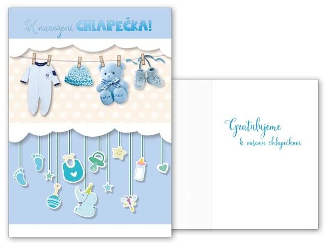 Přání k narození miminka - Narození miminka je veliká událost a je třeba ji oslavit. Pošlete novopečené mamince a tatínkovi blahopřání, které je zajisté potěší, a které jim bude připomínat radostné narození jejich miminka. Text na přední straně přání: K narození chlapečka Text uvnitř přání: Gratulujeme k vašemu chlapečkovi Přání je baleno v sáčku, součástí balení je i dopisní obálka.