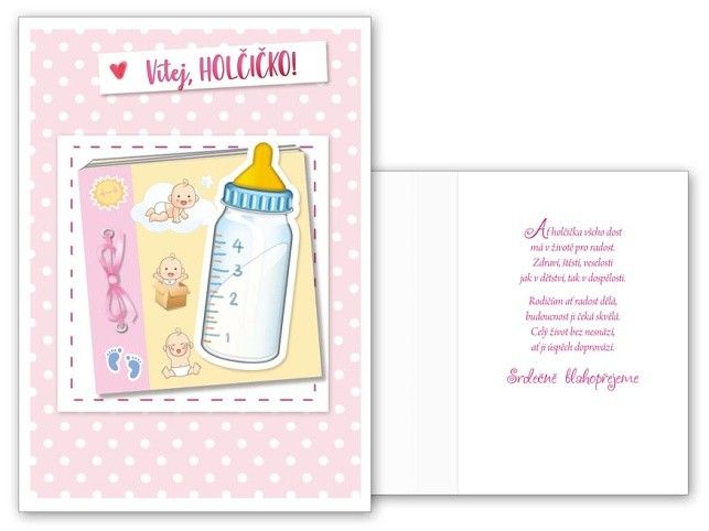 Přání k narození miminka - Narození miminka je veliká událost a je třeba ji oslavit. Pošlete novopečené mamince a tatínkovi blahopřání, které je zajisté potěší, a které jim bude připomínat radostné narození jejich miminka. Text na přední straně přání: Vítej, holčičko Text uvnitř přání: Ať holčička všeho dost má v životě pro radost. Zdraví, štěstí, veselosti jak v dětství tak v dospělosti. Rodičům ať radost dělá, budoucnost ho čeká skvělá. Celý život bez nesnází, Ať ho úspěch doprovází. Srdečně blahopřejeme Přání je baleno v sáčku, součástí balení je i dopisní obálka.