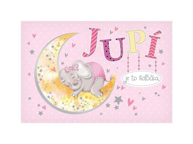 3D přání k narození miminka - Narození miminka je veliká událost a je třeba ji oslavit. Pošlete novopečené mamince a tatínkovi blahopřání, které je zajisté potěší, a které jim bude připomínat radostné narození jejich miminka. Při otevření přání se zobrazí 3D obrázek. Text na přední straně přání: Jupí je to holčička Text uvnitř přání: Bez textu. Přání je baleno v sáčku, součástí balení je i dopisní obálka.