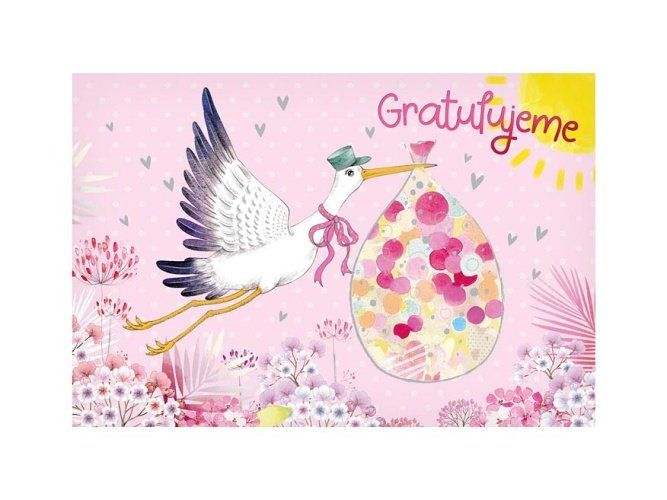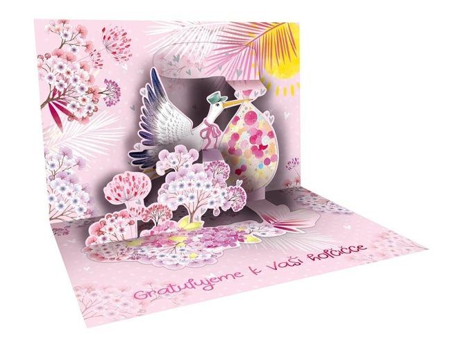 3D přání k narození miminka - Narození miminka je veliká událost a je třeba ji oslavit. Pošlete novopečené mamince a tatínkovi blahopřání, které je zajisté potěší, a které jim bude připomínat radostné narození jejich miminka. Při otevření přání se zobrazí 3D obrázek. Text na přední straně přání: Gratulujeme Text uvnitř přání: Gratulujeme k vaší holčičce. Přání je baleno v sáčku, součástí balení je i dopisní obálka.