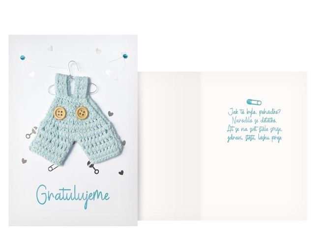 Roztomilé přání k narození chlapečka je zdobené háčkovanými růžovým kalhotkami.Toto přání je skvělým způsobem, jak pogratulovat novopečeným rodičům a přivítat na svět jejich syna s radostí a láskou. Text na přední straně přání: Gratulujeme Text uvnitř přání: Jak to bylo pohádko? Narodilo se děťátko. Ať se na svět stále směje, zdraví, štěstí, lásku přeje Papír: pohlednicový karton 240 g Přání je baleno v sáčku. Součástí přání je i obálka. Uvedená cena je za 1 ks.