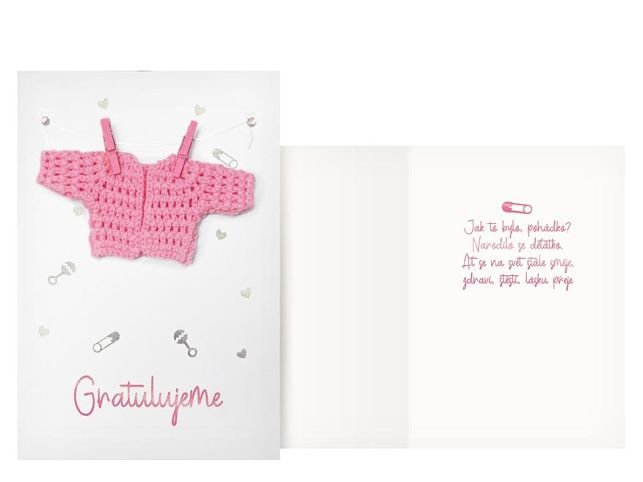 Roztomilé přání k narození holčičky je zdobené háčkovaným růžovým svetříkem. Toto přání je krásným způsobem, jak pogratulovat novopečeným rodičům a přivítat na svět jejich miminko s láskou a radostí. Text na přední straně přání: Gratulujeme Text uvnitř přání: Jak to bylo pohádko? Narodilo se děťátko. Ať se na svět stále směje, zdraví, štěstí, lásku přeje Papír: pohlednicový karton 240 g Přání je baleno v sáčku. Součástí přání je i obálka. Uvedená cena je za 1 ks.