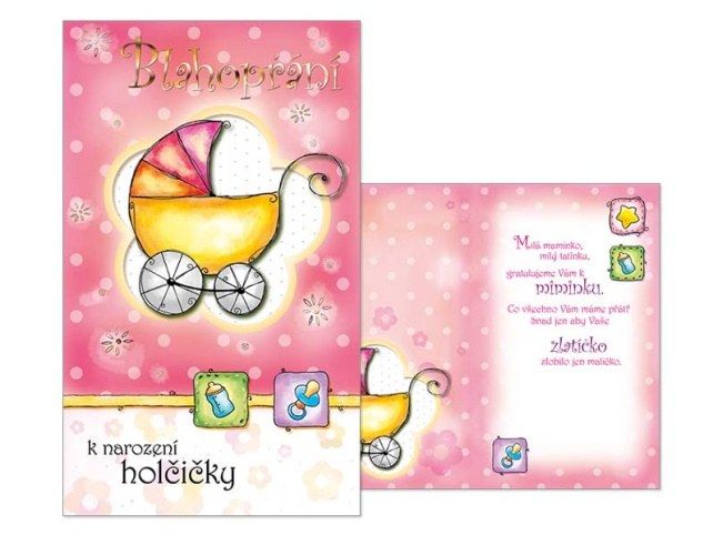 Přání k narození miminka s textem - PRO HOLČIČKU - Narození miminka je veliká událost a je třeba ji oslavit. Pošlete novopečené mamince a tatínkovi blahopřání, které je zajisté potěší, a které jim bude připomínat radostné narození jejich miminka. Přání je s obrázkem kočárku. Text na přední straně přání: Blahopřání k narození holčičky Text uvnitř přání: Milá maminko, milý tatínku, gratulujeme Vám k miminku. Co všechno Vám máme přát? Snad jen, aby Vaše zlatíčko, zlobilo jen maličko. Papír: pohlednicový karton 240 g Přání je baleno v sáčku, součástí balení je i dopisní obálka.