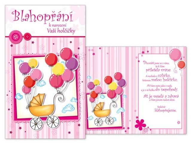 Přání k narození miminka s textem - PRO HOLČIČKU - Narození miminka je veliká událost a je třeba ji oslavit. Pošlete novopečené mamince a tatínkovi blahopřání, které je zajisté potěší, a které jim bude připomínat radostné narození jejich miminka. Přání je s obrázkem kočárku s balónky. Text na přední straně přání: Blahopřání k narození Vaší holčičky Text uvnitř přání: Dozvěděli jsme se z rána, že k Vám přiletěla vrána. A nechala v uzlíčku, krásnou malou holčičku. Ať Vám roste jako z vody, a je z ní holka do nepohody. Ať je veselá a zdravá a Vám jenom radost dává. Srdečně blahopřejeme. Papír: pohlednicový karton 240 g Přání je baleno v sáčku, součástí balení je i dopisní obálka.