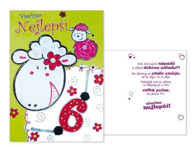 Dětské přání k 6. narozeninám s obrázkem ovečky - Oslavy narozenin patří k výjimečným a příjemným okamžikům v životě. Potěšte oslavence a spolu s dárkem mu věnujte originální a krásné přáníčko, které mu bude připomínat tuto radostnou událost. Přání je s obrázkem dvou oveček. Text na přední straně přání: Všechno nejlepší Text uvnitř přání: Kdo má nejvíc nápadů a věčně dobrou náladu?! Na všechny se stále směje, ať se děje, co se děje. Pokaždé má za ušima, a vždycky je s ním velká psina. No přece TY... všechno nejlepší! Papír: pohlednicový karton 240 g Přání je baleno v sáčku, součástí balení je i dopisní obálka. Přání je na obale označené doporučenou prodejní cenou.