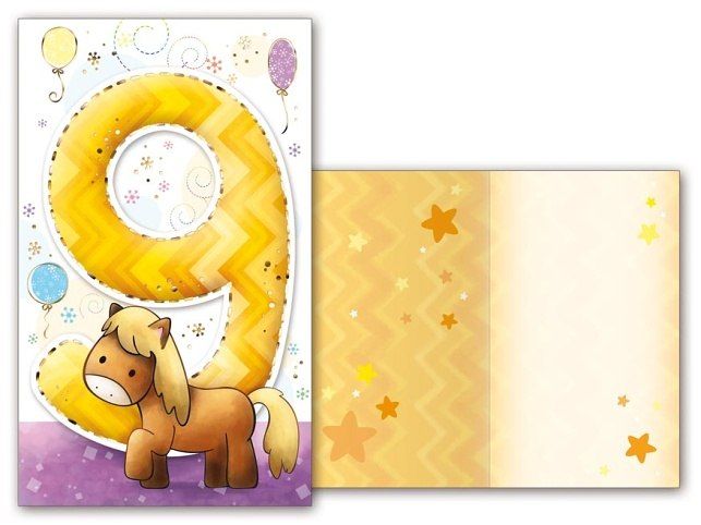 Dětské přání k 9. narozeninám s obrázkem - Oslavy narozenin patří k výjimečným a příjemným okamžikům v životě. Potěšte oslavence a spolu s dárkem mu věnujte originální a krásné přáníčko, které mu bude připomínat tuto radostnou událost. Přání je s obrázkem koníka. Text na přední straně přání: 9 Text uvnitř přání: Bez textu Papír: pohlednicový karton 240 g Přání je baleno v sáčku, součástí balení je i dopisní obálka.