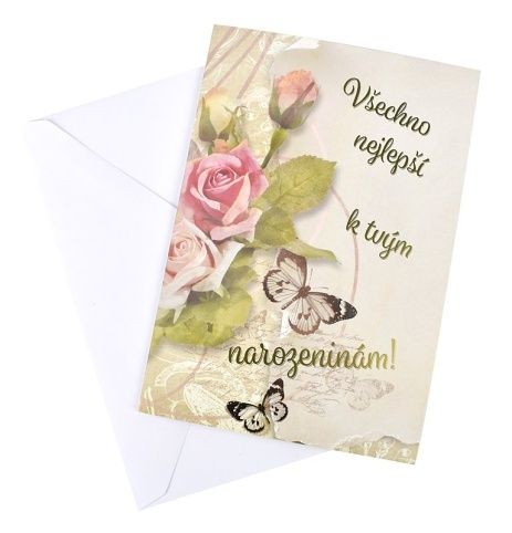 Přání k narozeninám, 13,5 x 19,5 cm, růže a motýl
