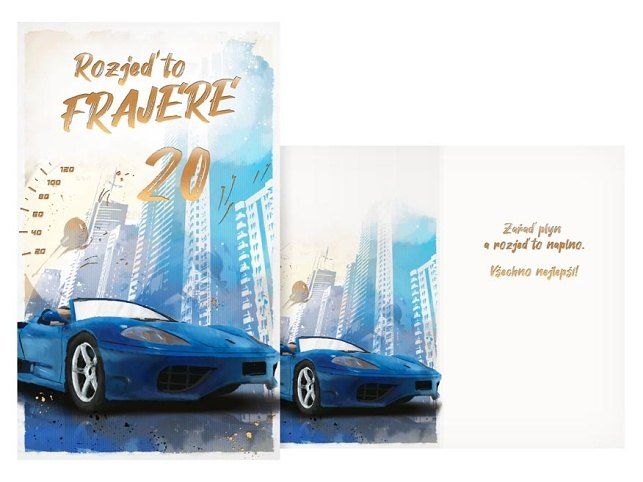Přání k 20. narozeninám. Přání je s obrázkem auta. Oslavy narozenin patří k výjimečným a příjemným okamžikům v životě. Potěšte oslavence a spolu s dárkem mu věnujte originální a krásné přáníčko, které mu bude připomínat tuto radostnou událost. Text na přední straně: Rozjeď to FRAJERE 20 Text uvnitř přání: Zařaď plyn a rozjeď to naplno. Všechno nejlepší! Papír: pohlednicový karton Přání je baleno v sáčku, součástí balení je i dopisní obálka. Uvedená cena je za 1 ks.