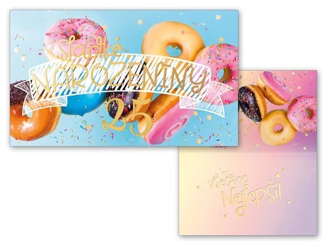 Přání k 25. narozeninám s textem - Oslavy narozenin patří k výjimečným a příjemným okamžikům v životě. Potěšte oslavence a spolu s dárkem mu věnujte originální a krásné přáníčko, které mu bude připomínat tuto radostnou událost. Přání je s obrázkem donutů. Text na přední straně přání: 25 Sladké narozeniny! Text uvnitř přání: Všechno nejlepší! Papír: pohlednicový karton 240 g Přání je baleno v sáčku, součástí balení je i dopisní obálka.