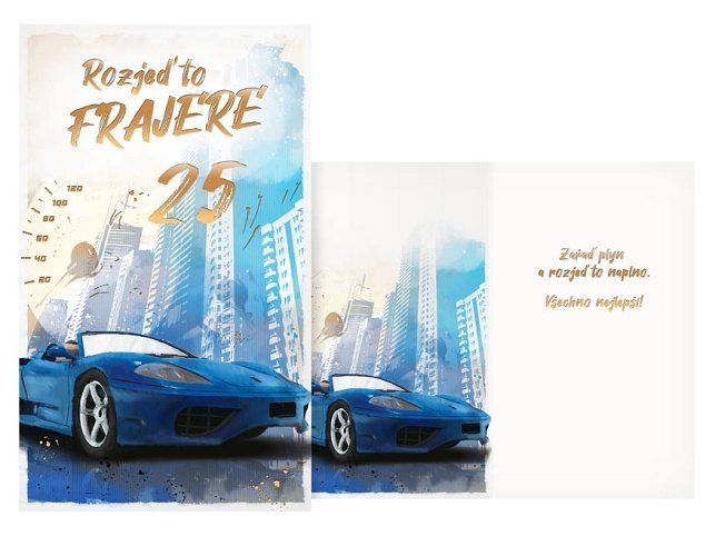 Přání k 25. narozeninám. Přání je s obrázkem auta. Oslavy narozenin patří k výjimečným a příjemným okamžikům v životě. Potěšte oslavence a spolu s dárkem mu věnujte originální a krásné přáníčko, které mu bude připomínat tuto radostnou událost. Text na přední straně: Rozjeď to FRAJERE 25 Text uvnitř přání: Zařaď plyn a rozjeď to naplno. Všechno nejlepší! Papír: pohlednicový karton Přání je baleno v sáčku, součástí balení je i dopisní obálka. Uvedená cena je za 1 ks.