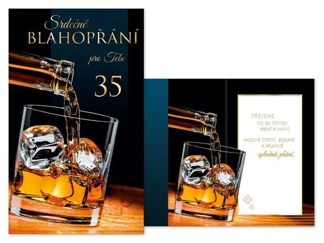 Přání k 35. narozeninám s textem - Oslavy narozenin patří k výjimečným a příjemným okamžikům v životě. Potěšte oslavence a spolu s dárkem mu věnujte originální a krásné přáníčko, které mu bude připomínat tuto radostnou událost. Přání je s obrázkem Whiskey. Text na přední straně přání: Srdečné BLAHOPŘÁNÍ pro Tebe 35 Text uvnitř přání: Přejeme, co za peníze není k mání, hodně štěstí, zdraví a hlavně splněná přání.. Papír: pohlednicový karton 240 g Přání je baleno v sáčku, součástí balení je i dopisní obálka.