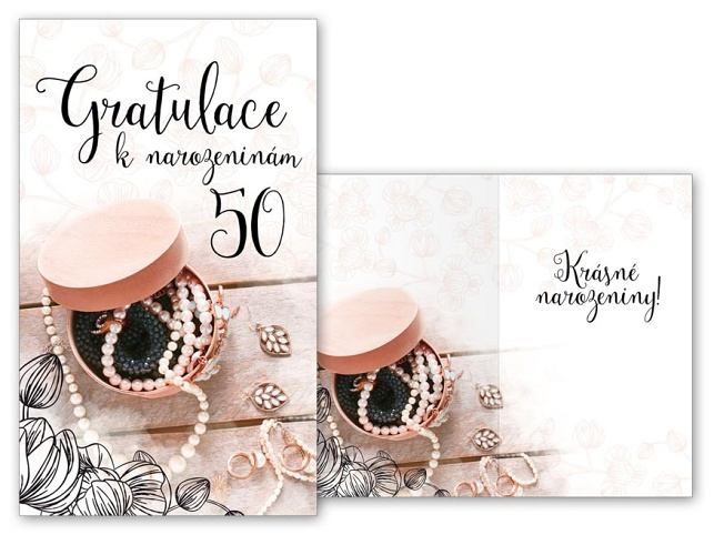 Přání k 50. narozeninám s textem - Oslavy narozenin patří k výjimečným a příjemným okamžikům v životě. Potěšte oslavence a spolu s dárkem mu věnujte originální a krásné přáníčko, které mu bude připomínat tuto radostnou událost. Přání je s obrázkem šperků. Text na přední straně přání: 50 Gratulace k narozeninám Text uvnitř přání: Krásné narozeniny! Papír: pohlednicový karton 240 g Přání je baleno v sáčku, součástí balení je i dopisní obálka.