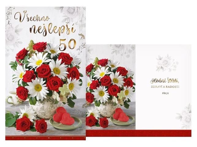 Přání k 50. narozeninám s nádherným květinovým motivem přináší elegantní a slavnostní nádech. Je ideálním způsobem, jak oslavenci popřát k významnému jubileu a společně s ním sdílet radost z tohoto výjimečného dne. Text na přední straně přání: Všechno nejlepší 50 Text uvnitř přání: Hodně štěstí, zdraví a radosti přeje Papír: pohlednicový karton Přání je baleno v sáčku, součástí balení je i dopisní obálka. Uvedená cena je za 1 ks.