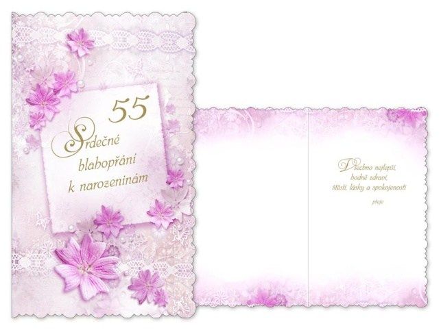 Přání k 55. narozeninám s textem - Oslavy narozenin patří k výjimečným a příjemným okamžikům v životě. Potěšte oslavence a spolu s dárkem mu věnujte originální a krásné přáníčko, které mu bude připomínat tuto radostnou událost. Přání je s obrázkem růžových květin. Text na přední straně přání: 55 srdečné blahopřání k narozeninám Text uvnitř přání: Všechno nejlepší, hodně zdraví , štěstí, lásky a spokojenosti přeje Papír: pohlednicový karton 240 g Přání je baleno v sáčku, součástí balení je i dopisní obálka.