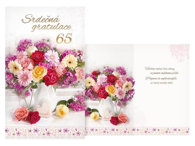 Přání k 65. narozeninám. Oslavy narozenin patří k výjimečným a příjemným okamžikům v životě. Potěšte oslavence a spolu s dárkem mu věnujte originální a krásné přáníčko, které mu bude připomínat tuto radostnou událost. Text na přední straně: Srdečná gratulace 65 Text uvnitř přání: Všechno nelze říci slovy, co jenom můžeme prát. Přejeme to nejkrásnější, co život může dát. Papír: pohlednicový karton Přání je baleno v sáčku, součástí balení je i dopisní obálka. Uvedená cena je za 1 ks.