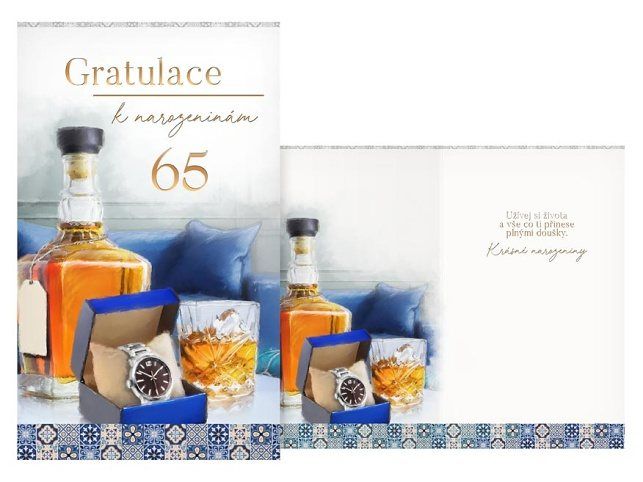 Přání k 65. narozeninám. Přání je s pánským motivem - whisky. Oslavy narozenin patří k výjimečným a příjemným okamžikům v životě. Potěšte oslavence a spolu s dárkem mu věnujte originální a krásné přáníčko, které mu bude připomínat tuto radostnou událost. Text na přední straně: Gratulace k narozeninám 65 Text uvnitř přání: Užívej si života a vše co ti přinese plnými doušky. Krásné narozeniny Papír: pohlednicový karton Přání je baleno v sáčku, součástí balení je i dopisní obálka. Uvedená cena je za 1 ks.