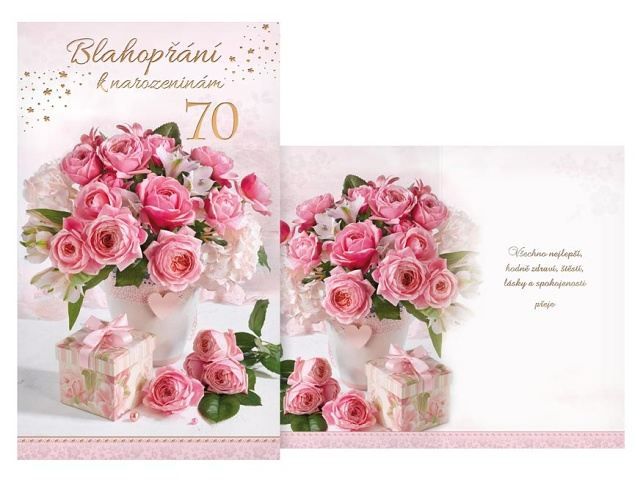 Přání k 70. narozeninám s krásným květinovým motivem. Narozeniny jsou jedinečnou příležitostí plnou radosti a oslav. Přidejte ke svému dárku něco navíc – krásné a originální přání, které oslavence zahřeje u srdce a bude mu připomínat radostné okamžiky tohoto výjimečného dne. Text na přední straně přání: Blahopřání k narozeninám 70 Text uvnitř přání: Všechno nejlepší, hodně zdraví, štěstí lásky a spokojenosti přeje Papír: pohlednicový karton Přání je baleno v sáčku, součástí balení je i dopisní obálka. Uvedená cena je za 1 ks.