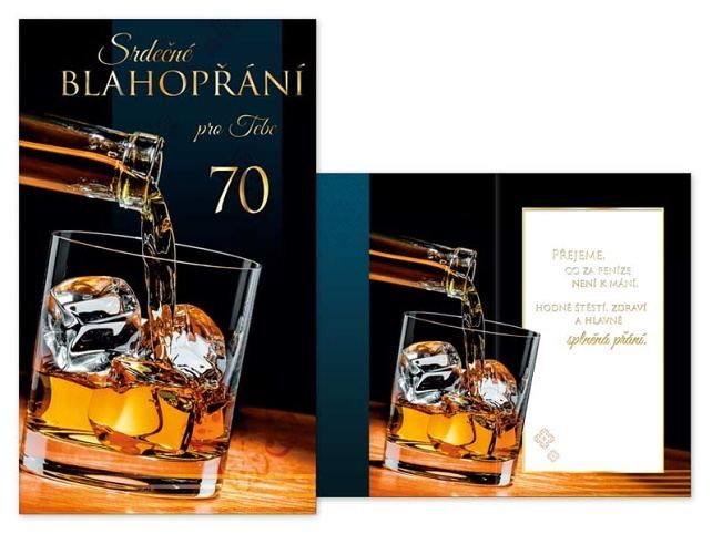 Přání k 70. narozeninám s textem - Oslavy narozenin patří k výjimečným a příjemným okamžikům v životě. Potěšte oslavence a spolu s dárkem mu věnujte originální a krásné přáníčko, které mu bude připomínat tuto radostnou událost. Přání je s obrázkem Whiskey. Text na přední straně přání: Srdečné BLAHOPŘÁNÍ pro Tebe 70 Text uvnitř přání: Přejeme, co za peníze není k mání, hodně štěstí, zdraví a hlavně splněná přání.. Papír: pohlednicový karton 240 g Přání je baleno v sáčku, součástí balení je i dopisní obálka.