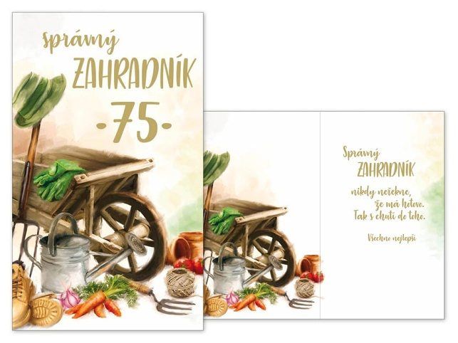 Přání k 75. narozeninám s textem - Oslavy narozenin patří k výjimečným a příjemným okamžikům v životě. Potěšte oslavence a spolu s dárkem mu věnujte originální a krásné přáníčko, které mu bude připomínat tuto radostnou událost. Přání je s obrázkem zahradního nářadí a zeleniny. Text na přední straně přání: 75 Správný zahradník Text uvnitř přání: Správný zahradník nikdy neřekne, že má hotovo. Tak s chutí do toho! Všechno nejlepší Papír: pohlednicový karton 240 g Přání je baleno v sáčku, součástí balení je i dopisní obálka.