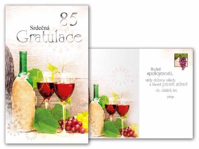 Přání k 85. narozeninám s textem - Oslavy narozenin patří k výjimečným a příjemným okamžikům v životě. Potěšte oslavence a spolu s dárkem mu věnujte originální a krásné přáníčko, které mu bude připomínat tuto radostnou událost. Přání je s obrázkem vína a skleniček. Text na přední straně přání: 85 Srdečná gratulace Text uvnitř přání: Hodně spokojenosti, vždy dobrou náladu a hlavně pevné zdraví do dalších let. přeje Papír: pohlednicový karton 240 g Přání je baleno v sáčku, součástí balení je i dopisní obálka.