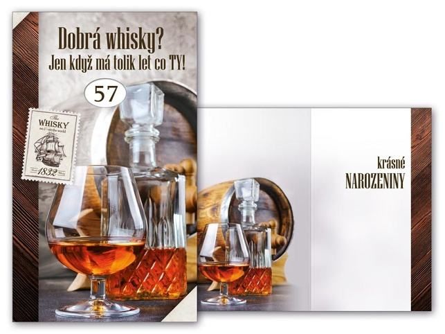 Přání k narozeninám otočné - Oslavy narozenin patří k výjimečným a příjemným okamžikům v životě. Potěště oslavence a spolu s dárkem mu věnujte originální a krásné přáníčko, které mu bude připomínat tuto radostnou událost. Díky dvěma otočným kolečkám můžete na přání nastavit požadovaný věk od 10 do 99 let. Přání je s obrázkem Whiskey. Text na přední straně přání: Dobrá whisky! Jen když má tolik let co TY! Text uvnitř přání: Krásné narozeniny Papír: pohlednicový karton 240 g Přání je baleno v sáčku, součástí balení je i dopisní obálka.