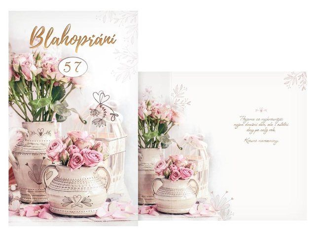 Přání otočné k narozeninám s textem. Přání je s obrázkem růží. Díky dvěma otočným kolečkám můžete na přání nastavit požadovaný věk od 10 do 99 let. Oslavy narozenin patří k výjimečným a příjemným okamžikům v životě. Potěště oslavence a spolu s dárkem mu věnujte originální a krásné přáníčko, které mu bude připomínat tuto radostnou událost. Text na přední straně přání: Blahopřání Text uvnitř přání: Přejeme co nejkrásnější nejen dnešní den, ale i ostatní dny po celý rok Krásné narozeniny Papír: pohlednicový karton 240 g Přání je baleno v sáčku, součástí balení je i dopisní obálka. Uvedená cena je za 1 ks.