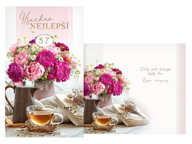 Přání otočné k narozeninám s textem. Přání je s obrázkem kytice květin a šálkem čaje. Díky dvěma otočným kolečkám můžete na přání nastavit požadovaný věk od 10 do 99 let. Oslavy narozenin patří k výjimečným a příjemným okamžikům v životě. Potěště oslavence a spolu s dárkem mu věnujte originální a krásné přáníčko, které mu bude připomínat tuto radostnou událost. Text na přední straně přání: Všechno nejlepší Text uvnitř přání: Děláš svět krásnější každý den Krásné narozeniny Papír: pohlednicový karton 240 g Přání je baleno v sáčku, součástí balení je i dopisní obálka. Uvedená cena je za 1 ks.