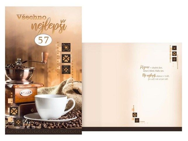 Přání otočné k narozeninám s textem. Přání je s obrázkem mlýnku na kávu. Díky dvěma otočným kolečkám můžete na přání nastavit požadovaný věk od 10 do 99 let. Oslavy narozenin patří k výjimečným a příjemným okamžikům v životě. Potěště oslavence a spolu s dárkem mu věnujte originální a krásné přáníčko, které mu bude připomínat tuto radostnou událost. Text na přední straně přání: Všechno nejlepší Text uvnitř přání: Přejeme v dnešní den, zdraví, štěstí, blaho jen. Vše nejlepší, slunce v tváři, po celý rok ať jen září. Papír: pohlednicový karton 240 g Přání je baleno v sáčku, součástí balení je i dopisní obálka. Uvedená cena je za 1 ks.