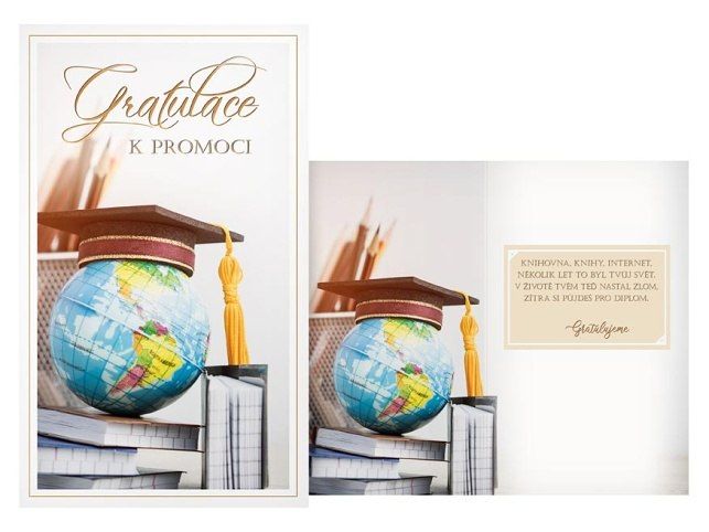 Přání k ukončení studia s textem. Oslavy ukončení studia patří k výjimečným a příjemným okamžikům v životě. Věnujte originální a krásné přáníčko, které bude připomínat tento životní milník. Text na přední straně přání: Gratulace K PROMOCI Text uvnitř přání: Knihovna, knihy, internet, několik let to byl Tvůj svět. V životě Tvém teď nastal zlom, zítra si půjdeš pro diplom. Gratulujeme Papír: pohlednicový karton 240 g Přání je baleno v sáčku, součástí balení je i dopisní obálka. Uvedená cena je az 1 ks.
