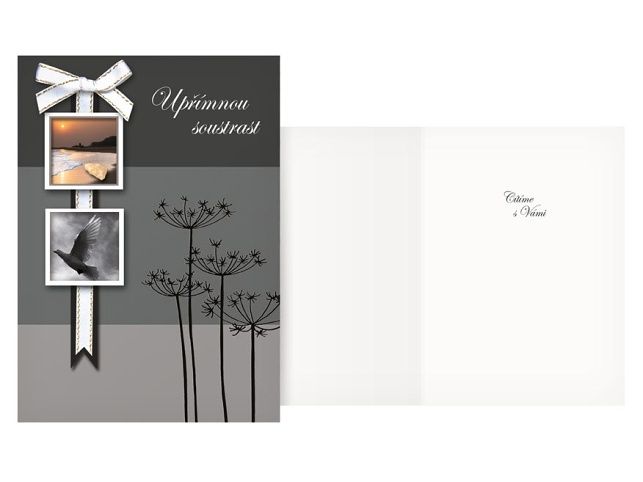 Úmrtí blízké osoby je vždy tragická událost. Vyjádřete kondolencí upřímnou soustrast a soucit pozůstalým. Kondolenční přání a smuteční květiny Vám zajistí důstojné rozloučení s Vaším blízkým člověkem. Přání je s obrázkem podzimního listí. Text na přední straně přání: Upřímnou soustrast Text uvnitř přání: Cítíme s Vámi Papír: pohlednicový karton 240 g Přání je baleno v sáčku, součástí balení je i dopisní obálka.