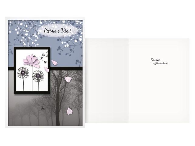 Úmrtí blízké osoby je vždy tragická událost. Vyjádřete kondolencí upřímnou soustrast a soucit pozůstalým. Kondolenční přání a smuteční květiny Vám zajistí důstojné rozloučení s Vaším blízkým člověkem. Přání je s obrázkem podzimního listí. Text na přední straně přání: Cítíme s Vámi Text uvnitř přání: Smutně vzpomínáme Papír: pohlednicový karton 240 g Přání je baleno v sáčku, součástí balení je i dopisní obálka.