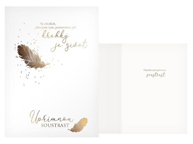 Úmrtí blízké osoby je vždy tragická událost. Vyjádřete kondolencí upřímnou soustrast a soucit pozůstalým. Kondolenční přání a smuteční květiny Vám zajistí důstojné rozloučení s Vaším blízkým člověkem. Text na přední straně přání: Ve chvílích, jako jsou tyto, poznáváme, jak křehký je život Upřímnou soustrast Text uvnitř přání: Přijměte naši upřímnou soustrast. Papír: pohlednicový karton 240g Přání je baleno v sáčku, součástí balení je i dopisní obálka.