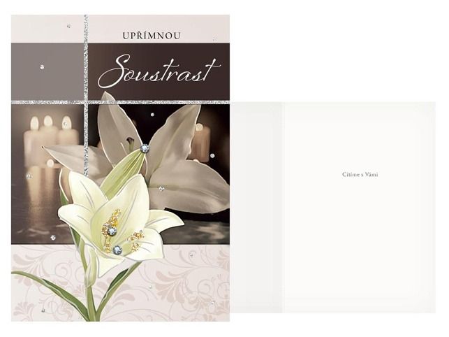 Úmrtí blízké osoby je vždy tragická událost. Vyjádřete kondolencí upřímnou soustrast a soucit pozůstalým. Kondolenční přání a smuteční květiny Vám zajistí důstojné rozloučení s Vaším blízkým člověkem. Text na přední straně přání: Upřímnou soustrast text uvnitř přání: Cítíme s Vámi Papír: pohlednicový karton 240g Přání je baleno v sáčku, součástí balení je i dopisní obálka.
