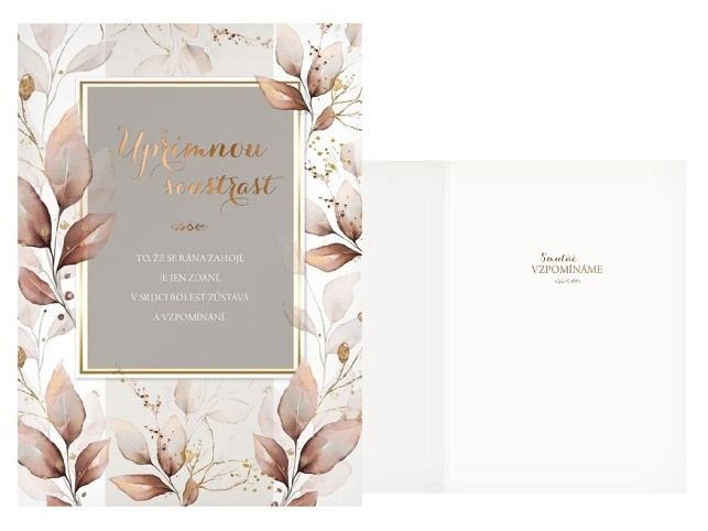 Úmrtí blízké osoby je vždy tragická událost. Vyjádřete kondolencí upřímnou soustrast a soucit pozůstalým. Kondolenční přání a smuteční květiny Vám zajistí důstojné rozloučení s Vaším blízkým člověkem. Text na přední straně přání: Upřímnou soustrast To, že se rána zahojí, je jen zdání, v srdci bolest zůstává a vzpomínání. Text uvnitř přání: Smutně vzpomínáme Papír: pohlednicový karton 240g Přání je baleno v sáčku, součástí balení je i dopisní obálka.