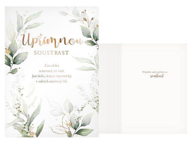 Úmrtí blízké osoby je vždy tragická událost. Vyjádřete kondolencí upřímnou soustrast a soucit pozůstalým. Kondolenční přání a smuteční květiny Vám zajistí důstojné rozloučení s Vaším blízkým člověkem. Text na přední straně přání: Upřímnou soustrast Čas ubíhá a nevrací, co vzal. Jen láska, úcta a vzpomínky v srdcích zůstávají dál. Text uvnitř přání: Přijměte naši upřímnou soustrast Papír: pohlednicový karton 240g Přání je baleno v sáčku, součástí balení je i dopisní obálka.