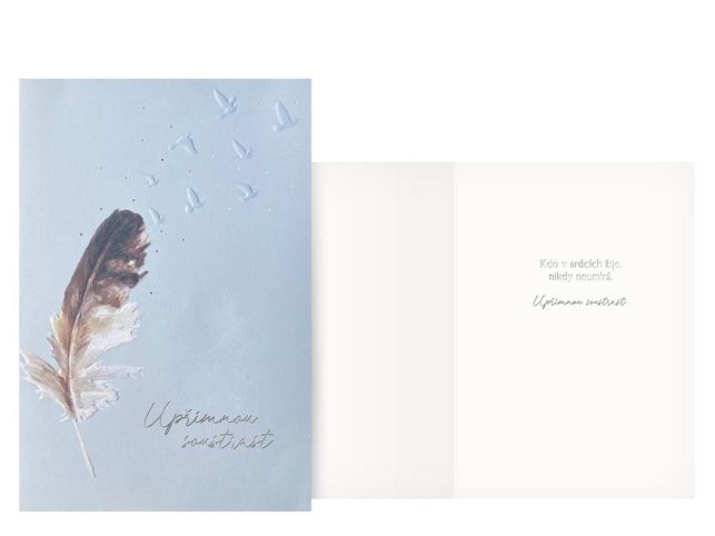 Vyjádření soucitu s jemností a úctou. Toto kondolenční přání s motivem pírka a ptáků v letu vyzařuje klid a symbolizuje věčnost vzpomínek. Decentní provedení v tlumených tónech dodává tomuto gestu důstojnost a hlubokou empatii. Přání, které s úctou a jemností přináší soustrast a podporu v těžkých chvílích. Text uvnitř přání: Upřímnou soustrast Text uvnitř přání:v Kdo v srdcích žije, nikdy neumírá. Upřímnou soustrast Papír: pohlednicový karton 240 g Přání je baleno v sáčku, součástí balení je i dopisní obálka. Uvedená cena je za 1 ks.