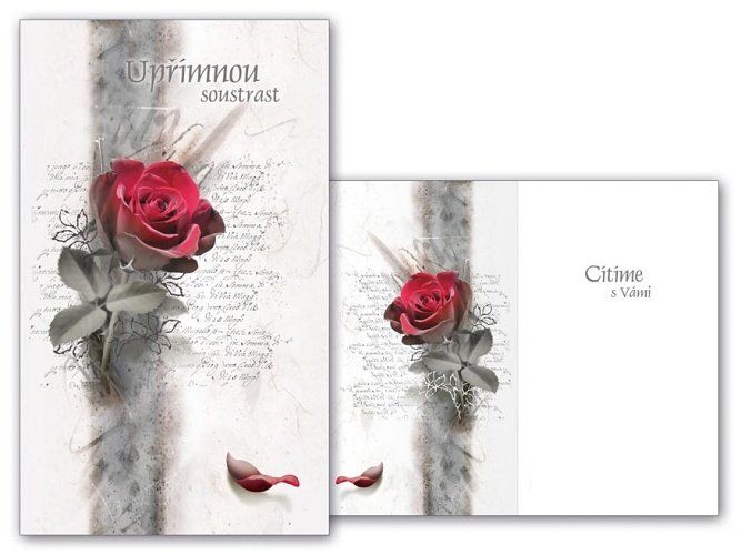 Úmrtí blízké osoby je vždy tragická událost. Vyjádřete kondolencí upřímnou soustrast a soucit pozůstalým. Kondolenční přání a smuteční květiny Vám zajistí důstojné rozloučení s vaším blízkým člověkem. Přání je s obrázkem růže. Text na přední straně přání: Upřímnou soustrast Text uvnitř přání: Cítíme s Vámi Papír: pohlednicový karton 240 g Přání je baleno v sáčku, součástí balení je i dopisní obálka.