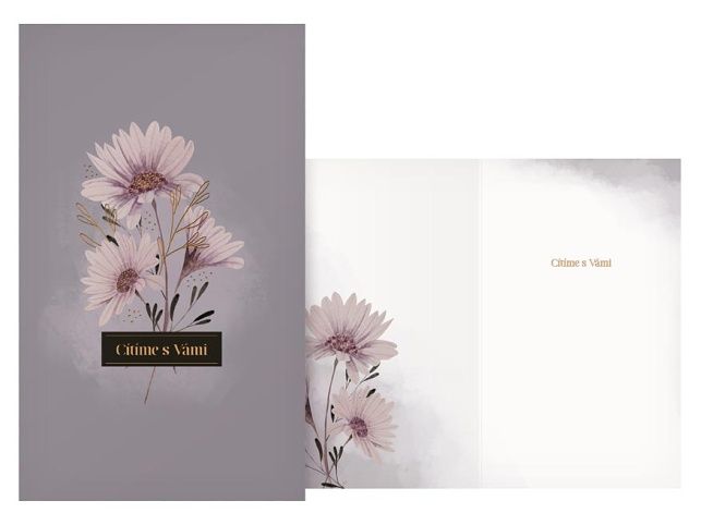 Jemné gesto podpory v těžkých chvílích Malé a vkusné přání, které pomáhá vyjádřit účast s citem a jemností. Květinový motiv na tlumeném šedém pozadí působí klidně a důstojně. Elegantní zpracování doplňuje jednoduchý, ale silný vzkaz uvnitř. Text na přední straně přání: Cítíme s Vámi Text uvnitř přání: Cítíme s Vámi Papír: pohlednicový karton 240 g Přání je baleno v sáčku, součástí balení je i dopisní obálka. Uvedená cena je za 1 ks.