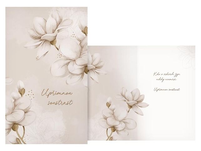 Jemné vyjádření soustrasti Decentní kondolenční přání v menším formátu s motivem bílé magnólie, která symbolizuje čistotu, tichou vzpomínku i naději. Uvnitř se nachází citlivě formulovaný text, který pomáhá vyjádřit upřímnou soustrast s laskavostí a respektem. Text na přední straně přání: Upřímnou soustrast Text uvnitř přání: Kdo v srdcích žije, nikdy neumírá. Upřímnou soustrast. Papír: pohlednicový karton 240 g Přání je baleno v sáčku, součástí balení je i dopisní obálka. Uvedená cena je za 1 ks.