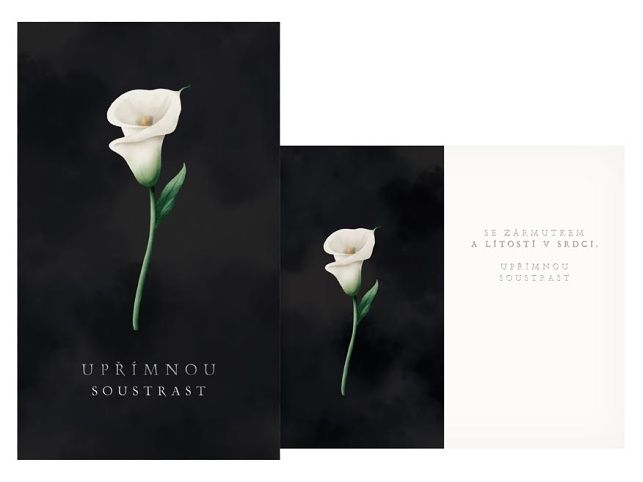 Důstojné vyjádření soustrasti Minimalistické kondolenční přání menší velikosti s ilustrací bílé kaly na tmavém pozadí. Tento výrazný a symbolický motiv představuje čistotu, ticho a úctu. Vnitřní text je stručný, ale silný – napsaný s respektem k prožívání ztráty. Text na přední straně přání: Upřímnou soustrast Text uvnitř přání: Se zármutkem a lítostí v srdci. Upřímnou soustrast Papír: pohlednicový karton 240 g Přání je baleno v sáčku, součástí balení je i dopisní obálka. Uvedená cena je za 1 ks.