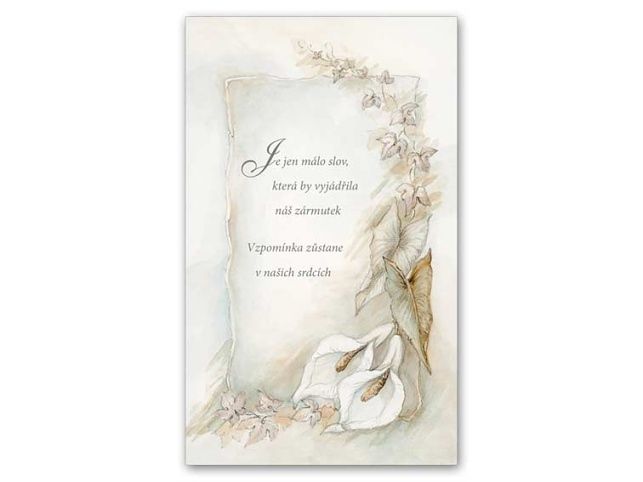 Úmrtí blízké osoby je vždy tragická událost. Vyjádřete kondolencí upřímnou soustrast a soucit pozůstalým. Kondolenční přání a smuteční květiny Vám zajistí důstojné rozloučení s vaším blízkým člověkem. Přání je s obrázkem bílých kalů a s listy. Text na přední straně přání: Je jen málo slov, která by vyjádřila náš zármutek. Vzpomínka zůstane v našich srdcích. Text uvnitř přání: Bez textu Papír: pohlednicový karton 240 g Přání je baleno v sáčku, součástí balení je i dopisní obálka.