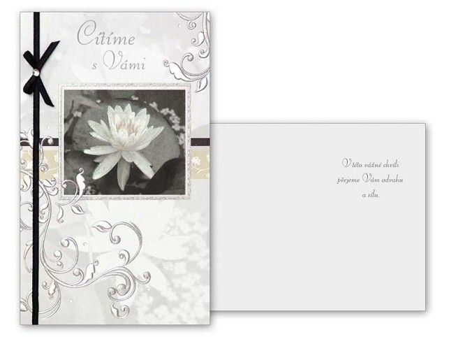 Úmrtí blízké osoby je vždy tragická událost. Vyjádřete kondolencí upřímnou soustrast a soucit pozůstalým. Kondolenční přání a smuteční květiny Vám zajistí důstojné rozloučení s vaším blízkým člověkem. Přání je s obrázkem bílého květu. Text na přední straně přání: Cítíme s Vámi Slova nemohou vyjádřit smutek který v tuto chvíli společně cítíme. Text uvnitř přání: Nelehké je pro nás rozloučení s těmi, které milujeme. V této vážné chvíli přejeme Vám odvahu a sílu. Papír: pohlednicový karton 240 g Přání je baleno v sáčku, součástí balení je i dopisní obálka.
