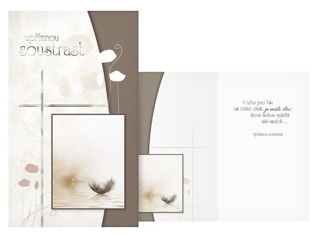 Úmrtí blízké osoby je vždy tragická událost. Vyjádřete kondolencí upřímnou soustrast a soucit pozůstalým. Kondolenční přání a smuteční květiny Vám zajistí důstojné rozloučení s vaším blízkým člověkem. Přání je s obrázkem peříčka. Text na přední straně přání: Upřímnou soustrast Text uvnitř přání: V této pro Vás tak těžké chvíli, je málo slov, která mohou vyjádřit náš smutek Papír: pohlednicový karton 240 g Přání je baleno v sáčku, součástí balení je i dopisní obálka.