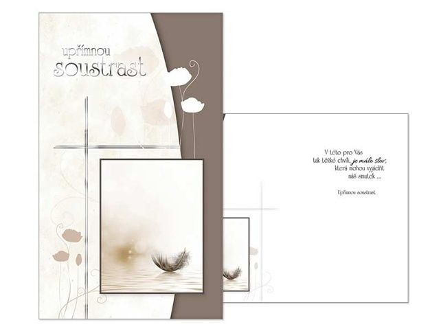 Úmrtí blízké osoby je vždy tragická událost. Vyjádřete kondolencí upřímnou soustrast a soucit pozůstalým. Kondolenční přání a smuteční květiny Vám zajistí důstojné rozloučení s vaším blízkým člověkem. Přání je s obrázkem peříčka. Text na přední straně přání: Upřímnou soustrast Text uvnitř přání: V této pro Vás tak těžké chvíli, je málo slov, která mohou vyjádřit náš smutek Papír: pohlednicový karton 240 g Přání je baleno v sáčku, součástí balení je i dopisní obálka.
